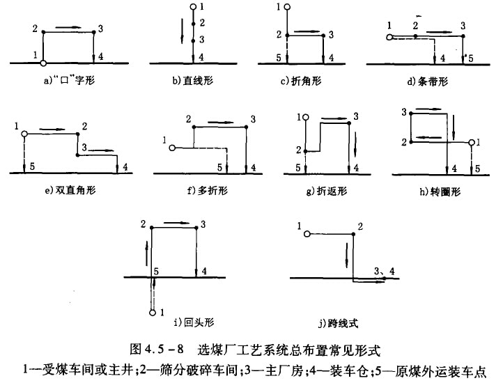 9)回頭形:為選煤廠布置在礦井鐵路站場(chǎng)異側(cè)時(shí)最常見(jiàn)之布置形式,與“口”字形有相仿之處。
