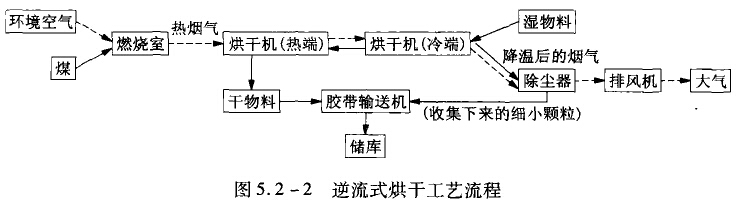 逆流式烘干工藝流程如圖5.2-2所示。在逆流式烘干工藝流程中,物料運動方向與熱煙氣的流向是相反的。