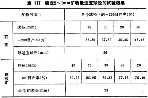 采用2~lmm的石英及2~lmm的磁鐵礦各占50%的混合礦料進(jìn)行磨碎,在磨碎前先用試驗(yàn)方法確定2~lmm石英及磁鐵礦所需的最適宜球徑(表117)。