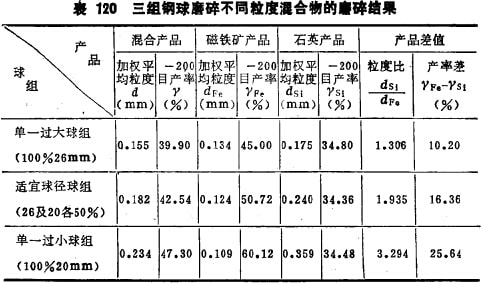 根據(jù)此不同粒度礦物混合物的粒度組成情況(即50%2~1mm石英及50%1~0.5mm磁鐵礦的混合物),最適宜球徑的配比應(yīng)該是26mm及20mm鋼球各占50%; 26mm球?yàn)?00%時(shí)則為過(guò)大球組;20mm球占100%時(shí)則為過(guò)小球組。三組球的球荷重量及磨礦條件均相同,三組球的磨碎結(jié)果列于表120。