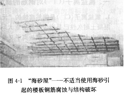 我國大規(guī)模經(jīng)濟(jì)建設(shè)的飛速發(fā)展,使沿海地區(qū)陸續(xù)出現(xiàn)河砂短缺現(xiàn)象。我國沿海地區(qū)愉挖、濫用海砂現(xiàn)象出來已久,1999年同土資源部發(fā)布了《關(guān)于加強海砂開采管理的通知》,提出在保護(hù)海洋環(huán)境的前提下,允許有序地開發(fā)海砂資源,以解決建筑用砂問題。這本是“變廢為寶”的好事,然而,不合理地使用海砂,卻會給國家和民眾帶來麻煩乃至災(zāi)難。這是因為海砂中含鹽,會腐蝕鋼筋、破壞混凝土結(jié)構(gòu)。如果使用不合格海砂,建筑物就會發(fā)生結(jié)構(gòu)破壞甚至跨塌(一般可在1-15年內(nèi)暴露出來)。一旦遭遇地震,這樣的建筑物可能最先倒塌。所謂“海砂屋”就是指使用了不合格海砂所建造的建筑物(公用、民用或基礎(chǔ)設(shè)施),是屬于質(zhì)量低劣的建筑(圖4-1)。