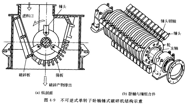 錘式破碎機包括臥軸錘式破碎機和立軸錘式破碎機兩種,常見的是臥軸錘式破碎機,即水平錘式破碎機。水平軸由兩端的軸承支持,原料借助重力或用輸送機送入。轉(zhuǎn)于下方裝有篦條篩,篦條縫隙的大小決定破碎后的顆粒的大小。圖4-9所不為不可逆式單轉(zhuǎn)子臥軸錘式破碎機結(jié)構(gòu)示意。