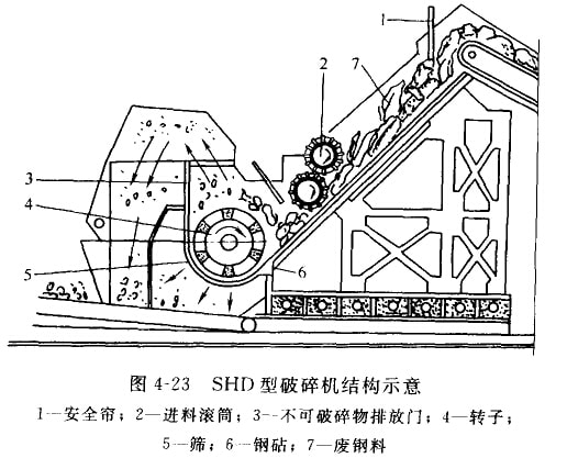 SHD型廢鋼破碎機(jī)結(jié)構(gòu)如圖4-23所示,功率與生產(chǎn)能力如表4-5所示。