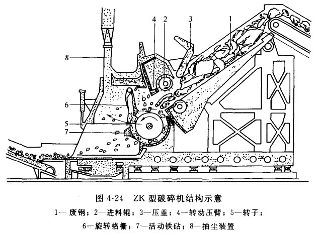 左下方設(shè)有活動(dòng)鐵砧,可以調(diào)節(jié)轉(zhuǎn)于錘頭勺砧之間的間隙,從而獲得預(yù)期尺寸的破碎鋼片。旋轉(zhuǎn)格柵起到篩和不可破碎物排放門的雙重作用。③轉(zhuǎn)于的旋轉(zhuǎn)方向嶼供料方向一致,物料進(jìn)入破碎機(jī)后,首先是保持在破碎腔上方?善扑槲镞M(jìn)入轉(zhuǎn)子與砧之間后被擊破撕裂成小塊,不可破碎物(重型廢鋼)將在轉(zhuǎn)于的驅(qū)動(dòng)廠撞向活動(dòng)格柵,使其向后轉(zhuǎn)動(dòng),從而離開了破碎機(jī)。這是ZK型破碎機(jī)的最大特點(diǎn)。ZK型破碎機(jī)結(jié)構(gòu)如圖4-24所示,其功率與生產(chǎn)能力如表4-6所示。