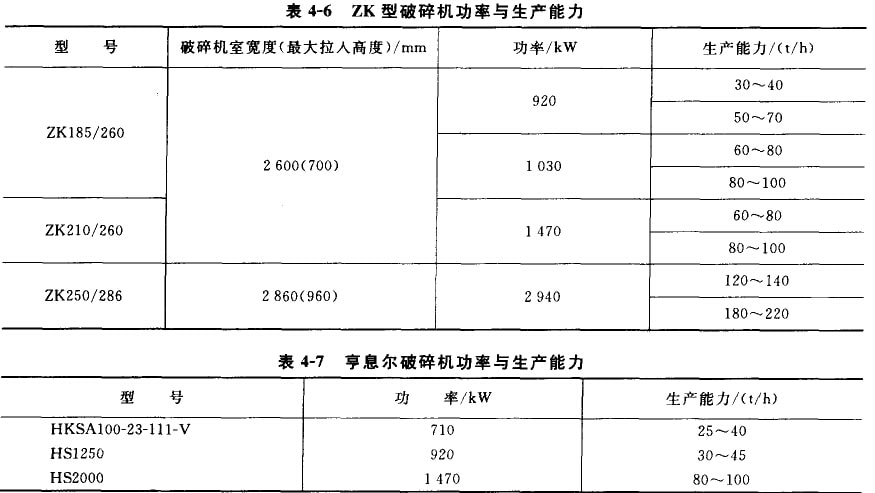立式破碎機(jī)世界上使用較少,90%以上的用廣都選用臥式。亨息爾公司的臥式破碎機(jī)與美國(guó)紐維爾公司的產(chǎn)品相似,這里不再贅述,其功率與作產(chǎn)能力見表4-7。