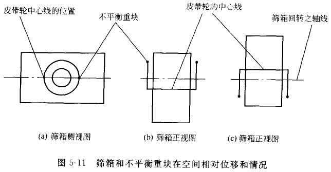 皮帶輪偏心式自定中心圓振動篩的工作原理如圖5-17(b)所示。這種篩子的主袖沒有偏心袖頸,不平衡重輪(皮帶輪)的軸孔與不平衡重輪不同心,具有一定的偏心距,并且軸孔中心處于不平衡重的上方。因此,豐軸的中心線與不平衡重輪的中心線不在一根軸線上。從圖中可見,OO為不平衡重輪(皮帶輪)的中心線,O′O′以為主軸的中心線。當篩子工作時,皮帶輪繞本身中心線OO回轉,穿過篩箱重心的主鈾O′O′,也繞過OO回轉。因此,與軸求偏心式的原理一樣.必須使篩箱和不平衡重塊產生大小相等、方向相反的離心慣性力,并且使皮帶輪軸孔的偏心地r等于篩箱振幅A。當滿足這些條件時,就能達到皮帶輪中心線OO在車間的位置不變。