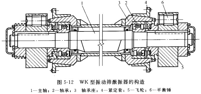 WK型圓振動篩激振器的構造如圖5-12所示。在這種激振器中,產生振動的不平衡重量分別布置在軸1的中段和構端的飛輪5上。這樣的結構,一方面可以減小軸的彎矩,同時也便改變激振器的激振力,達到調整篩于振幅的目的。鈾1用一對雙列向心球面滾子軸承裝在軸承席3上,并通過緊定套4與篩箱連接。激振器的軸承,外側采用迷宮式密封,內側用毛氈密封,并用套筒將侗心軸封閉起來。