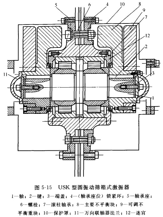 USK型圓振動篩采用箱式激振器(圖5-15)。該激振器有一根支承在兩個滾柱軸承上的短軸,軸的兩端固走著不平衡重塊。不平衡重塊由主要小平衡重塊和可調不平衡重塊兩部分組成。主要不平衡重塊固定在袖卜,可調小平衡重塊用螺栓固定在主要不平衡重塊上。