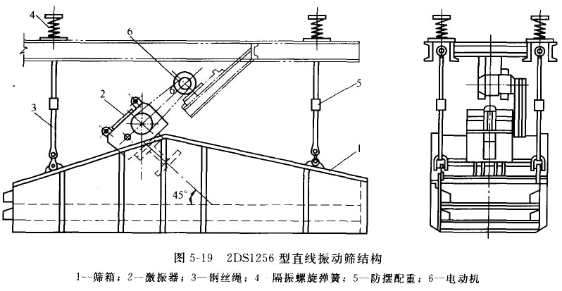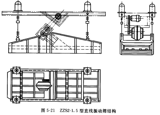 ZZS型直線振動(dòng)篩也是一種吊掛式振動(dòng)篩,有ZZDS2-1.5型和ZZS1-1.8型兩種,前者為雙層篩面,后者為單層篩面。這種篩分機(jī)結(jié)構(gòu)簡(jiǎn)單,工作可靠。