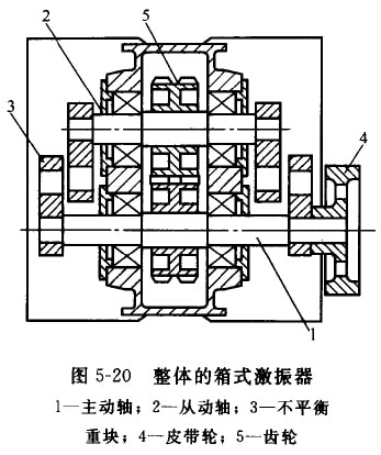 DS系列直線振動(dòng)篩采用整體的箱式激振器(見圖5-20)。激振器的箱體用35號(hào)鑄俐制成。箱體內(nèi)槳有主動(dòng)軸1和從動(dòng)軸2,軸上各有一對(duì)重 量相向的不平衡員塊(偏心塊)3,皮帶輪4帶動(dòng)土軸問轉(zhuǎn),通過一對(duì)齒輪5使從動(dòng)軸做反向心同歲的回轉(zhuǎn),利用個(gè)平衡玉回轉(zhuǎn)時(shí)產(chǎn)生的離 心力使激振器產(chǎn)牛定向的激扼力。該激振器具有以下結(jié)構(gòu)特點(diǎn)。①平衡重塊成對(duì)地布量在激銀器箱體外面。這樣可使箱內(nèi)結(jié)構(gòu)緊湊;便 于調(diào)整不平衡重塊上面的配重柱塞,以改變篩稻的振幅;同時(shí),也避免不平衡重塊回轉(zhuǎn)時(shí),碰擊箱體內(nèi)的潤(rùn)滑油而引起箱體發(fā)熱。齒輪 對(duì)安裝在箱體內(nèi),使其潤(rùn)滑可靠,傳動(dòng)平穩(wěn)。②制成整體式,沒有別分面,在承受激振力時(shí)較合理,制造簡(jiǎn)單,但拆裝困難。