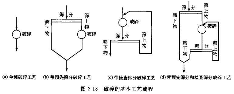 根據(jù)固體廢物的性質(zhì)、顆粒的大小、要求達(dá)到的破碎比和選用的破碎機(jī)類型,每段破碎流程可以有不同的組合方式,其基本的工藝流程如圖2-18所示。