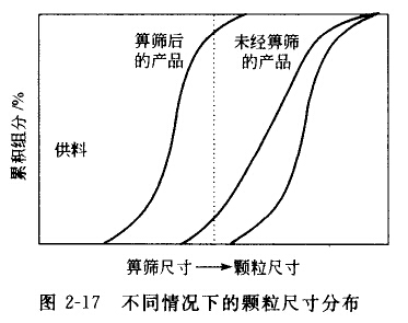 從圖2-17中可以看出,供料以及產(chǎn)品的顆粒尺寸分布曲線都是典型的“S”形。破碎過程中若無篦篩以限制出料的最大尺寸,則一些具有最大尺寸部分的物料在尺寸并未減小的情況下通過破碎系統(tǒng)是完全有可能的,而從整體上講,大部分顆粒的尺寸都減小了,這就使得該產(chǎn)品的PSD為一更寬的分布。如果系統(tǒng)中設(shè)有算篩,則產(chǎn)品的PSD曲線明顯左移。然而,由于原物料和破碎后的廢物的形狀不規(guī)則,一些大于篦篩升孔尺寸的顆粒,從對角位置或以一端向下的形式而透篩的情況時(shí)有發(fā)生,因此,篦篩產(chǎn)品的PSD曲線的一段要超過篦篩尺寸。
