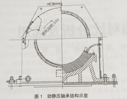 最初磨機規(guī)格較小時,基本上都是用此類主軸承。其工作原理是,磨機還沒運轉(zhuǎn)時,先啟動潤滑站的高壓泵,高壓油進入到主軸承的油腔中頂起中空軸,在軸承和中空軸之間形成一層油膜,當(dāng)磨機筒體開始旋轉(zhuǎn)時,利用軸承的楔形油腔產(chǎn)生的動壓效應(yīng),在軸承和中空軸之間形成一層穩(wěn)定的油膜,同時潤滑站的高壓系統(tǒng)停止供油,低壓系統(tǒng)向主軸承的頂部供 低壓油,低壓油灑在旋轉(zhuǎn)的中空軸上,對已經(jīng)形成的油膜進行油量補充。動靜壓軸承的結(jié)構(gòu)如圖1所示。