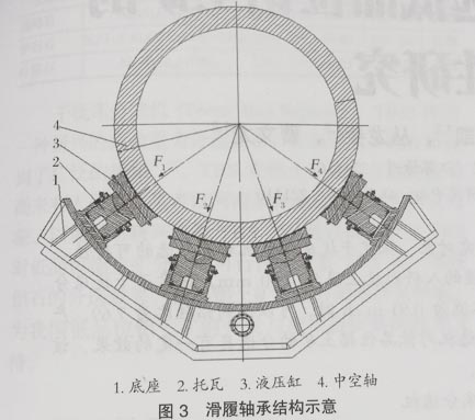 隨著磨機規(guī)格的不斷增大,動靜壓軸承已不能滿足磨機的發(fā)展要靜壓軸承。其工作原理是,在磨機運轉(zhuǎn)過程中液壓系統(tǒng)持續(xù)向軸承供高壓油,依靠高壓油使軸承和中空軸之間形成承裁油膜,使軸頸和軸承相對轉(zhuǎn)動時處于完全液體摩擦狀態(tài): 摩擦因數(shù)很小,一般在0.000 1-0.0004之間,因此啟動力矩小,效率高。靜壓軸承的結(jié)構(gòu)如圖2所示。