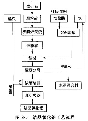 結(jié)晶氯化鋁的制各工藝為:按配比稱取一定量的經(jīng)焙燒、粉碎后的煤酐石和20%的鹽酸溶液,加入反應(yīng)釜中,在一定條件下反應(yīng)后,加入含量15%的聚丙烯酷胺凝聚劑進(jìn)行沉陷,真空抽濾,母液濃縮得結(jié)晶氯化鋁租品,進(jìn)一步精制即得到含三氮化鋁98.9%的一級(jí)品。其工藝流程如圖8-5所示。