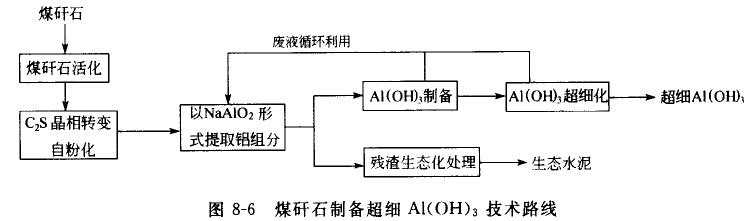 呂淑珍等采用礦物組成改性技術(shù)活化煤肝心中的Al2O3,消除阻止C2S晶相轉(zhuǎn)變的干擾因素,實(shí)現(xiàn)了煤矸石活化燒結(jié)料100%的自粉化,自粉化料平均粒徑小于1μm;用8%碳酸鈉溶液可從白粉化料中以NaAlO2的形式提取鋁組分,用高效分散-炭化法制備超細(xì)Al(OH)3,工藝流程如圖8-6所示,其平均粒度小于200nm,為煤矸石的高價(jià)值利用開(kāi)辟了一條新的途徑。