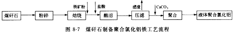 用煤矸石制備聚合氰化鋁鐵主要是利用煤矸石中的Al2O3、Fe2O3(Fe2O3含量低時(shí)需外加一定量的鐵礦石)與鹽酸反應(yīng)生成AlCl3和FeCl3,然后再通過(guò)聚合反應(yīng)制取聚合氯化鋁鐵,其工藝流程如圖8-7所示。