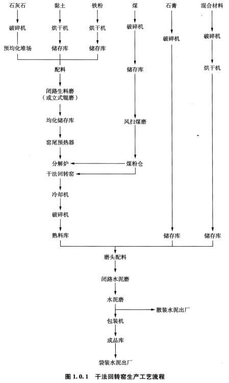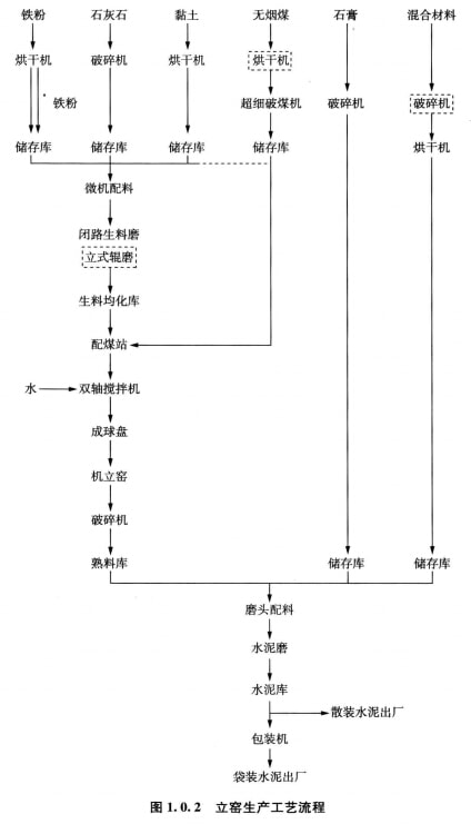 水泥生產(chǎn)工藝流程有干法回轉(zhuǎn)窯生產(chǎn)工藝流程、濕法回轉(zhuǎn)窯生產(chǎn)工藝流程和立窯生產(chǎn)工藝流程等。于法回轉(zhuǎn)窯生產(chǎn)工藝流程見圖1.0.1,立窯生產(chǎn)丁藝流程見圖1.0.2。