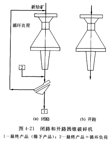 開路圓錐破碎機(jī)圖4-21(b)的破碎比不超過4-6。這種破碎機(jī)的主要優(yōu)點(diǎn)是在處理硬的和磨蝕性強(qiáng)的物料時(shí)技術(shù)性能變化較小,在哈薩克斯坦的杰茲L茲干礦床處埋硫化銅礦石,在從開路變?yōu)殚]路破碎時(shí),破腫機(jī)產(chǎn)量從250t/h減小到16t/h,產(chǎn)品粒度從35mm減小至16mm。盡管必須增加工作區(qū)表向積和安裝一些附加設(shè)備,促這種閉路流程是合理的,因此,球磨機(jī)的產(chǎn)量增加了22%。