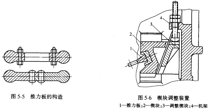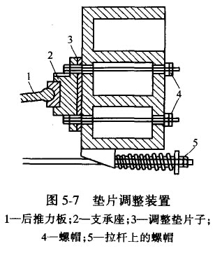 (2)墊片調(diào)整裝置。如圖5-7所示,在后推力板1的支承座2后面放入一組厚度相同的墊片3,改變墊片的數(shù)量,即可達到調(diào)整徘礦口大小的目的。在調(diào)整排礦口時,要先特螺帽4及拉桿彈簧螺帽5松開,然后增加或減少墊片的數(shù)目,待排礦口調(diào)整好后,再將螺帽4上緊,并調(diào)整彈簧上的螺帽5。用此法可以達到多級調(diào)整,調(diào)整時也比較方便,同時可以使機器結(jié)構(gòu)緊湊和質(zhì)量減小。但調(diào)整時必須停車。這種方法常用在大、中型碎礦機上。