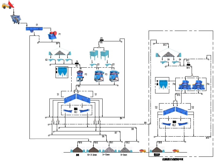 該系統(tǒng)示意工藝適用于時(shí)產(chǎn)800噸花崗巖、玄武巖類(lèi)硬性物料的加工破碎,將經(jīng)過(guò)爆破處理或開(kāi)挖、洞采的大塊毛料通過(guò)自卸車(chē)上 料至原料倉(cāng),經(jīng)過(guò)具有預(yù)篩分功能的棒條給料機(jī)均勻的供給顎式破碎機(jī)破碎,經(jīng)顎式破碎機(jī)破碎后的半成品物料通過(guò)皮帶機(jī)輸送給具 有中細(xì)碎功能的圓錐破碎機(jī)進(jìn)行二次破碎,經(jīng)圓錐破碎機(jī)二次破碎后的混合成品骨料經(jīng)過(guò)皮帶機(jī)輸送至后續(xù)一篩車(chē)間進(jìn)行分級(jí)篩分, 篩分將大于用戶(hù)需要的大顆粒物料再通過(guò)皮帶機(jī)輸送至細(xì)碎圓錐破碎機(jī)進(jìn)行破碎,破碎后的物料也進(jìn)入一篩車(chē)間進(jìn)行篩分,滿(mǎn)足客戶(hù) 需要的合格成品通過(guò)皮帶機(jī)輸送至成品料倉(cāng),不符合要求的大顆粒再次返回細(xì)碎圓錐破碎機(jī)進(jìn)行循環(huán)破碎。如果成品砂需要水洗也可 在一篩下面配置洗砂機(jī)用于成品砂的水洗。該系統(tǒng)的棒條給料機(jī)還具有預(yù)篩分功能,可以將原料中的細(xì)顆粒物料提前分離直接進(jìn)入后 續(xù)的破碎設(shè)備,也可將原料中的泥土雜物作為棄料預(yù)先分離。