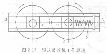 下圖為輥式破碎機的結(jié)構(gòu)及工作原理。輥1安裝在機架3上的固定軸承4上,輥2則被可動軸承4所支持。兩個輥子分別用兩個電動機帶動,并作相向轉(zhuǎn)動。礦石出上部給入,破碎是在兩個輥子間形成的空隙中進行的。金屬礦山由于多使用光滑輥面,所以破碎作用主要是靠壓碎,計附帶有些研磨作用(當為齒面時則上要靠劈碎作用)。破碎后的物料借重力自行排出。這種破碎機的特點是由于物料通過兩個輥子中間時只受壓一次,所以過粉碎現(xiàn)象少。