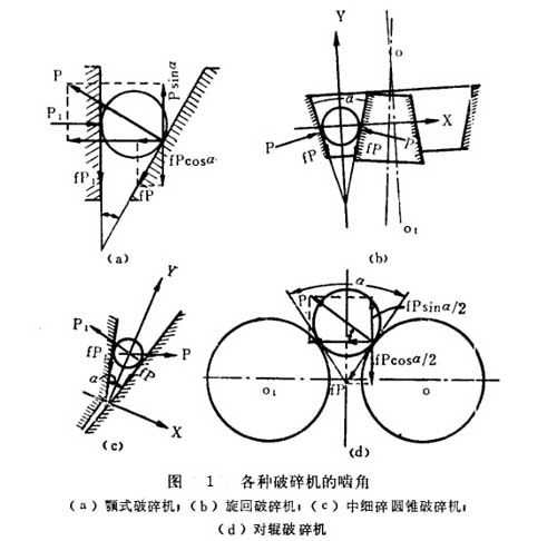 其它各種破碎機(jī)的嚙角都處在上述兩種破碎機(jī)嚙角形式之,因此極限嚙角都應(yīng)小于二倍摩擦角。所以,此結(jié)論適用于各種破碎機(jī)。