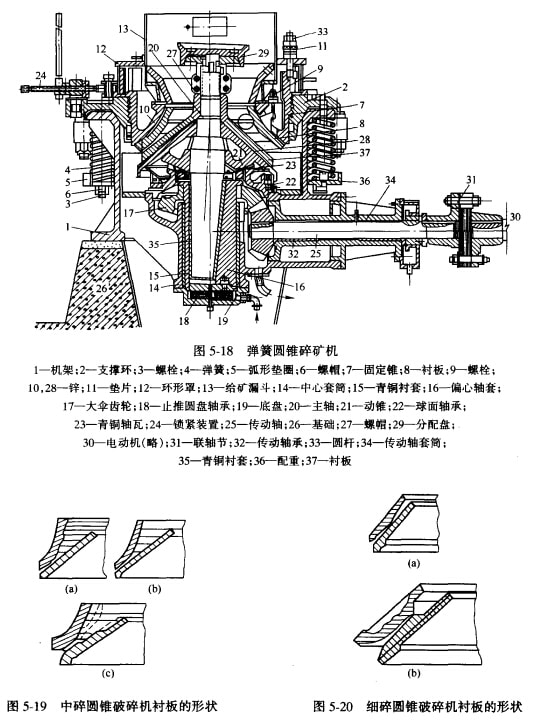 彈簧圓錐碎礦機的構(gòu)造,如圖5-18所示。破碎機機架l的上部裝有支撐環(huán)2,支撐環(huán)與機架用長螺栓3和彈簧4連接起來,螺栓的栓頭在支撐環(huán)的法蘭盤上,螺栓的下端穿過弧形墊圈5上的孔,然后用螺帽6扣緊。固定錐7的外表面用螺紋與支撐環(huán)內(nèi)表面旋接在一起。固定錐的內(nèi)表面鑲有錳鋼制造的襯板8。襯板與固定錐之間澆鑄一層鋅10,以保證錐體與襯板結(jié)合緊密。在固定錐的上面蓋有環(huán)形罩12,用圓桿33與固定錐連在一起,并用楔鐵緊壓,給礦漏斗13固定在環(huán)形罩上。