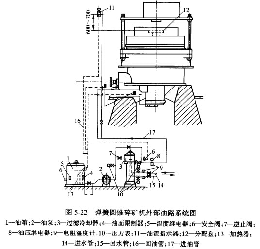 碎礦機的潤滑,是采用循環(huán)液體油集中潤滑,油通過油泵從機架下中心套簡14側(cè)壁上的油孔進入偏心軸套的止推團盤中。由于圓盤上有放射狀油溝,故圓盤得以潤滑,然后由此處分為三路上升。一路沿青銅襯套與偏心軸套間的間隙上升嚴路從偏心軸套與主袖間的間隙上升;一路沿主軸的中心圓孔上升,流至動錐底部球面與球面青銅軸瓦問的間隙中。并潤滑這些摩擦面。然后這三路油匯合在一起,流經(jīng)大小傘齒輪并潤滑之。最后順流而下至排油管排出,流回原油箱中。潤滑汕不僅起到潤滑作用,而且?guī)ё吡烁髂Σ撩娈a(chǎn)生的熱量,所以在油流回油箱前要經(jīng)過冷卻裝置,使油冷卻后再回至油箱中。水平傳動軸與軸承的潤滑是單獨的油路系統(tǒng)。調(diào)整環(huán)和支撐環(huán)上的梯形調(diào)整螺紋,是從支撐環(huán)側(cè)壁上的注油孔向螺紋注入黃干油來潤滑的。圖5-22是彈簧圓錐碎礦機外部油路系統(tǒng)圖。