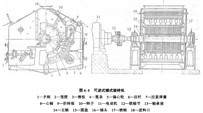 圖6-5是可逆式錘式破碎機(jī)的結(jié)構(gòu)。這種破碎機(jī)的應(yīng)用范圍與不可逆式錘式破碎機(jī)相同。但是,由于它的轉(zhuǎn)子10可以正、反兩方向旋轉(zhuǎn),所以它的主要零、部件都是對(duì)稱市置的,給料口18也就必須設(shè)置在機(jī)器的正中上方。