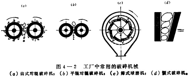 在工廠中常用的破碎機(jī)有;齒式對輥破碎機(jī),如圖4-2(a),兩個表面帶齒的輥子相對轉(zhuǎn)動,牙齒不斷作用于料塊上,使料塊破碎;平輥對輥破碎機(jī),如圖4-2(b),兩個相對旋轉(zhuǎn)的平滑圓輥不斷地壓在科塊上,將科塊壓碎;帶篩網(wǎng)式球磨機(jī)(篩式球磨機(jī)),如圖4-2(c),在回轉(zhuǎn)的筒體內(nèi)借鋼球的撞擊力和研磨作用,使料塊破碎;顎式破碎機(jī),如圖4-2(d),通過擺動的顎板對料塊施加周期性的壓力,將料塊破碎。