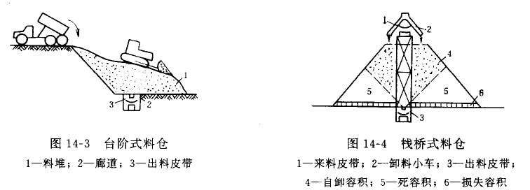 (1)臺(tái)階式料倉(cāng)。如圖14—3所示,利用高差地形,將料倉(cāng)布置在進(jìn)料線路下方,出汽車(chē)或鐵路礦車(chē)直接卸料。料倉(cāng)底部設(shè)有出料廊道(又稱(chēng)地弄),砂石料通過(guò)卸料弧形閥門(mén)卸在皮帶機(jī)上運(yùn)出。為了擴(kuò)大堆料容積,可用推土機(jī)集料或散料。這種料倉(cāng)設(shè)備簡(jiǎn)單,但須有合適的地形條件。