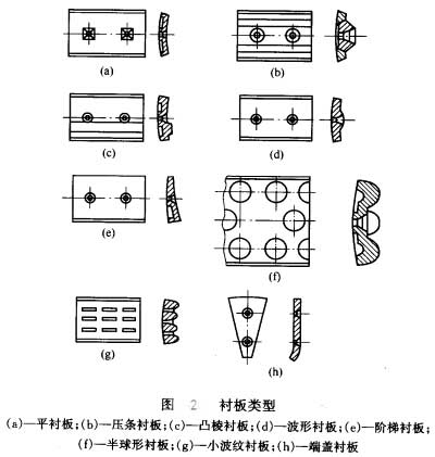 常用襯板的形狀見圖2,形狀較平滑的襯板使鋼球同襯板之間的相對滑動較大,產(chǎn)生鉸多的研磨作用,在相同轉(zhuǎn)速下鋼球被提升的高度和拋射所耗的功較少,適于細磨。凸起部較高的襯板對鋼球的推舉作用強,使鋼球能升至較高的位置,沖擊作用較強。橡膠襯板耐磨損(壽命比猛鋼材板高2—3倍)重量輕(比錳鋼襯板輕約85%)、拆裝方便、噪聲小。
