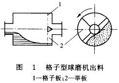 另一種球磨機是在出料端附近有格子板。格子板由若干塊扇形板組成,扇形板上有寬度為8—20mm的篩孔,物料可通過篩孔而聚集在格子板與右端蓋之間的空間內(nèi)。此空間內(nèi)有若干塊輻射狀的舉板。筒體轉(zhuǎn)動時.舉板將物料向上提舉,物料下落時經(jīng)過錐形塊而向出料端折轉(zhuǎn),經(jīng)右端中空軸排出。由于格子板和舉板的作用,物料在出料端的料位較低,使排料加快,生產(chǎn)量提高,參見圖1。