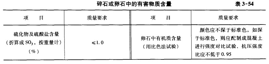 ⑦有害物質(zhì)含量:碎石或卵石中的硫化物和硫酸鹽含量,以及卵石中有機(jī)雜質(zhì)含量,應(yīng)符合表3-54的規(guī)定。