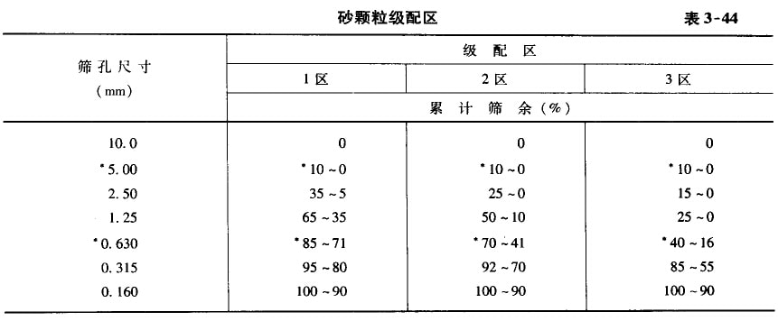 對(duì)于細(xì)度模數(shù)為3.7—1.6的砂,按0.630mm篩孔的累計(jì)篩余量(以重量百分率計(jì))分成三個(gè)級(jí)配區(qū)。砂的顆粒級(jí)配,應(yīng)處于表3 -44中的任何一個(gè)級(jí)配區(qū)以?xún)?nèi)。