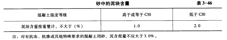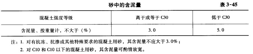 砂的含泥量(即粒徑小于0.080mm的塵屑、淤泥和豹土的總含量)應(yīng)符合表3—45的規(guī)定。