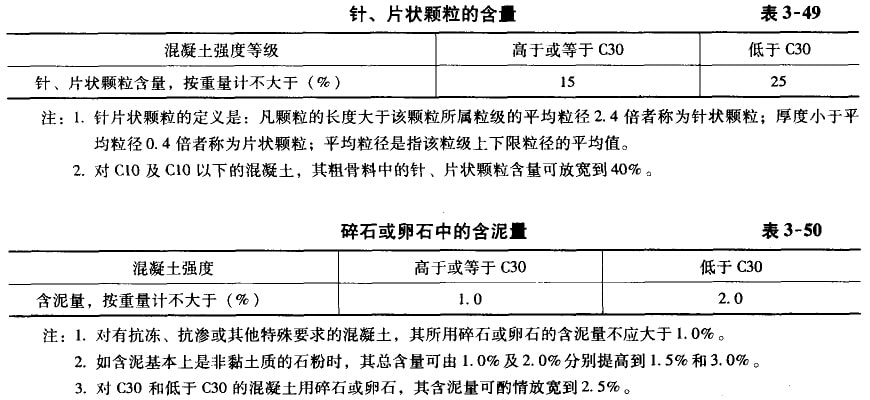 ②針、片狀顆粒含量:碎石或卵石中針、片狀顆粒含量.應(yīng)符合表3-49的要求。