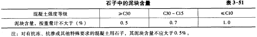 ③含泥量:碎石或卵石中的含泥量(即顆粒小于0.080Mm的塵屑、淤泥和教土的總含量,下同)應(yīng)符合表3—50的規(guī)定,但不宜含 有塊狀熟土。