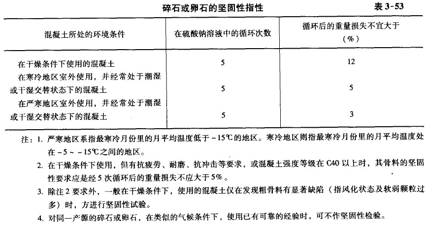 ⑥堅(jiān)固性:當(dāng)采用硫酸鈉溶液法作堅(jiān)同性檢驗(yàn)時(shí),其指標(biāo)應(yīng)符合表3-53的規(guī)定。