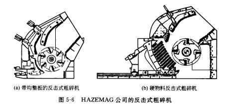 HAZEMAG公司開發(fā)了硬物料的反擊式粗碎機(jī)。這種破碎機(jī)的工作件都以耐磨性很高的高鉻合金制造,其硬度高達(dá)HRC60以上,并有一定的沖擊韌性。在結(jié)構(gòu)上也注重工作金屬的充分利用。型號APPKM1615的破碎機(jī)的最大進(jìn)料粒度為0.8m,出料粒度<56mm的占90%,破碎玄武石的生產(chǎn)能力可達(dá)350t/h。
